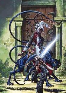 "A pale, slender figure with long silver hair flees through the dark grove, her desperate footfalls making hardly a whisper. Behind her and to either side, two feline monsters pursue her in eerie silence toward a ruined bell tower. Their black, six-legged forms are hard to focus on clearly.