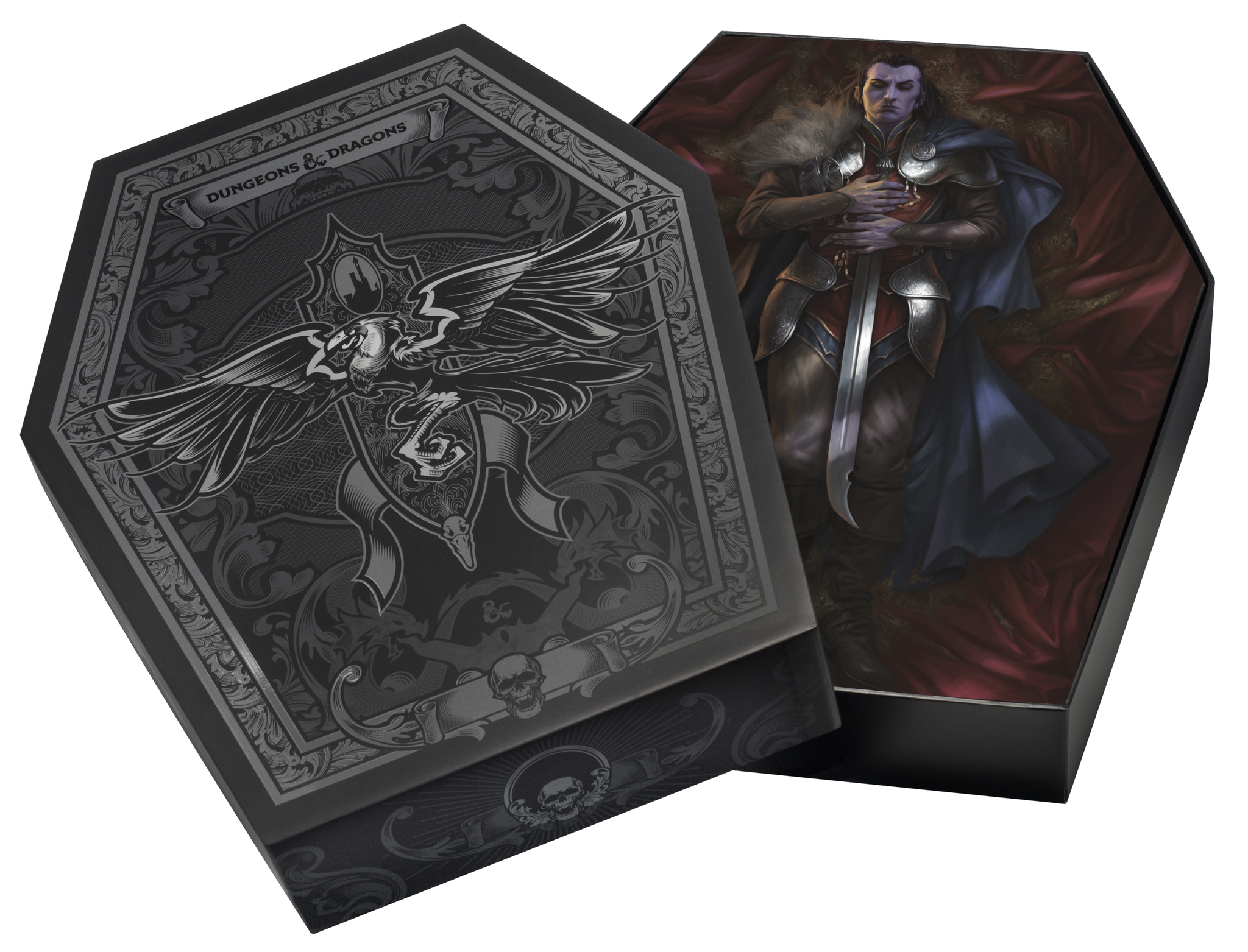 I feel like none of the artists quite nailed the "grill" of the mouth of the dragon. It looks a little off in every image. I think it might have been a mistake to have the grill shaped like a smiling face. It's a bummer because the idea is very cool.They are releasing a deluxe version of Curse of Strahd. Check out that box. It's a coffin! And Strahd is lying in it.It comes with a couple of booklets: